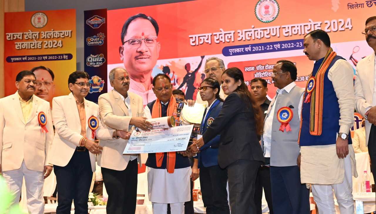 Chhattisgarh , Raipur :  मुख्यमंत्री विष्णु देव साय राष्ट्रीय खेल दिवस के पर ओलंपिक खेलों में स्वर्ण पदक जीतने वाले छत्तीसगढ़ के खिलाड़ियों को तीन करोड़ रुपए, रजत पदक जीतने वाले खिलाड़ियों को दो करोड़ रुपए और कांस्य पदक जीतने वाले खिलाड़ियों को एक करोड़ रुपए की पुरस्कार राशि देने की घोषणा की।    उन्होंने पंडित दीनदयाल उपाध्याय ऑडिटोरियम में आयोजित राज्य खेल अलंकरण समारोह में विभिन्न खेल विधाओं के 502 प्रतिभावान खिलाड़ियों को पुरस्कृत किया और उन्हें 01 करोड़ 36 लाख रूपए वितरित की।