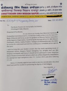 फिल्म अभिनेत्री कंगना रनौत द्वारा निर्मित फिल्म इमरजेंसी में सिख समाज के बारे में दी गई गलत जानकारियों, घटनाओं, सिख समाज को आतंकवादी बताया जाना और पूर्व प्रधानमंत्री इंदिरा गांधी की हत्या के सीन के साथ-साथ फिल्म अभिनेत्री एवम सांसद कंगना रनौत के बयानों पर आपत्ति करते हुए छत्तीसगढ़ सिख समाज आंदोलन करने पूरी तरह तैयार है | इस संबंध में सिख समाज द्वारा राज्यपाल एवं मुख्यमंत्री को पत्र लिखकर समाज की भावनाओं और अपनी बातों से अवगत कराने, ज्ञापन सौंपने अतिशीघ्र मिलने का समय मांगा है |