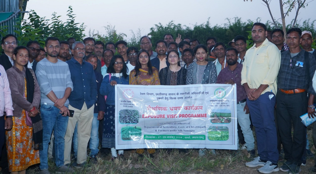 रायपुर : राज्य सरकार प्रदेश के रेशम किसानों के आर्थिक सशक्तिकरण एवं निरंतर उन्नति के लिए निरंतर प्रयास कर रहे हैं। इसी सिलसिले में प्रदेश के 100 रेशम किसानों का अध्ययन दल महाराष्ट्र के वर्धा में स्थापित रेशम कृषि की उन्नत तकनीक का अध्ययन किया। इन रेशम किसानों को मिट्टी, पौधे, कृमिपालन, कृमिपालन हेतु उपकरण, सिंचाई आदि सहित तकनीकी बारीकियों का प्रशिक्षण दिया गया।
