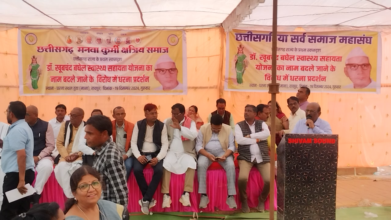 रायपुर: छत्तीसगढ़ शासन द्रारा डॉक्टर खूबचंद बघेल स्वास्थ्य सहायता योजना का नाम बदले जाने से अक्रोशित मनवा कुर्मी क्षत्रिय समाज , छत्तीसगढ़ प्रदेश कुर्मी समाज सहित सतनामी समाज, धोबी समाज, सेन समाज, साहू समाज, चंद्राकर समाज, एवं सर्वे छत्तीसगढ़िया समाज के प्रदेश भर से हजारों की संख्या मे धरना/प्रदर्शन मे भाग लिए!