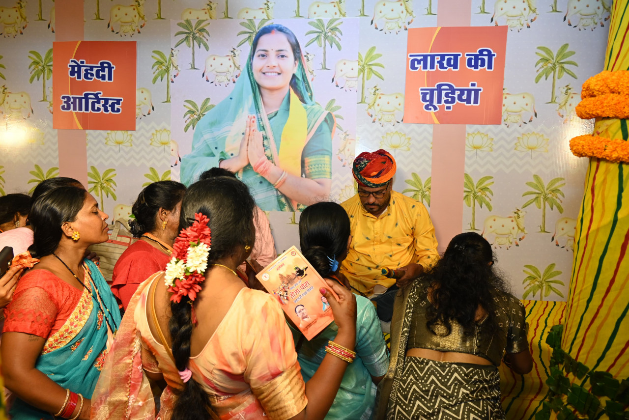 मुख्यमंत्री निवास में मुख्यमंत्री विष्णु देव साय की तरफ से तीजा पोरा त्यौहार मनाने आई महिलाओं को अपने विष्णु भैया से उपहार में मिली लाख की चूड़ियां, यहां आए कारीगर बहनों को उनकी नाप की चूड़ियां तैयार करके दे रहे हैं।