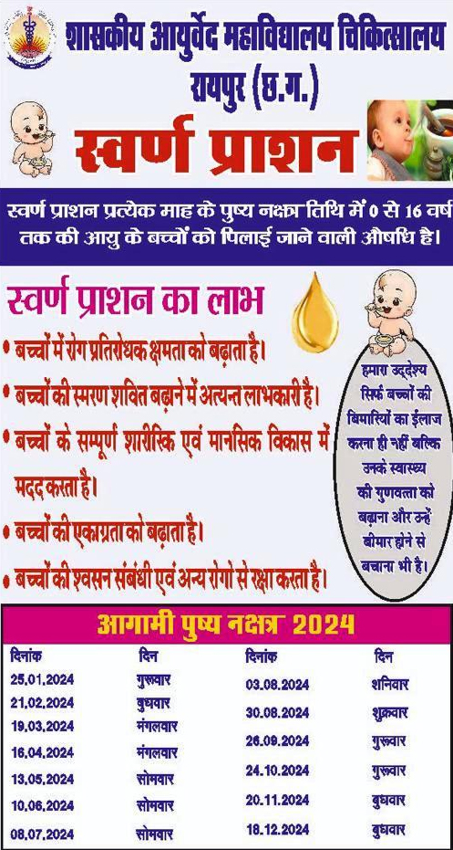 शासकीय आयुर्वेद महाविद्यालय चिकित्सालय में हर पुष्य नक्षत्र तिथि में बच्चों के लिए स्वर्णप्राशन का आयोजन किया जाता है। स्वर्णप्राशन हर महीने की पुष्य नक्षत्र तिथि में शून्य से 16 वर्ष के बच्चों को पिलाई जाने वाली औषधि है। इस साल 3 अगस्त के साथ ही अन्य पुष्य नक्षत्र तिथियों 30 अगस्त, 26 सितम्बर, 24 अक्टूबर, 20 नवम्बर और 18 दिसम्बर को भी स्वर्णप्राशन कराया जाएगा।