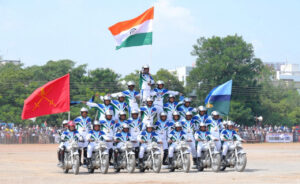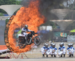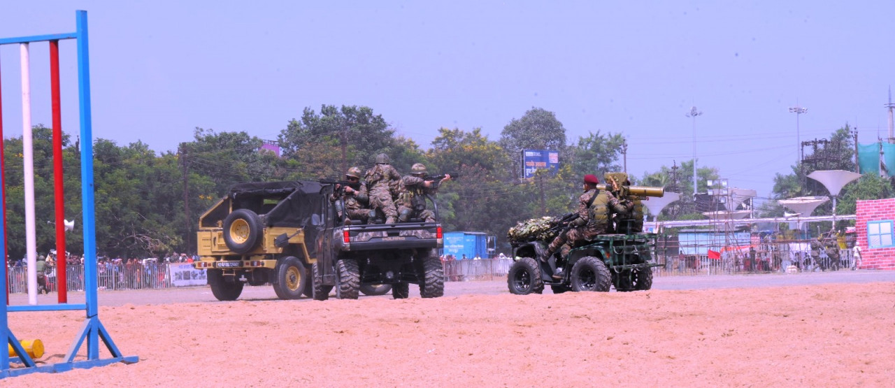 भारतीय सेना के डेयर डेविल्स ने अपने करतब और अदम्य साहस का परिचय देते हुए रोमांचित कर दिया। डेयर डेविल्स के डबल क्रॉसिंग, पेरलल क्रॉसिंग के करतब को देखकर दर्शकों ने खूब तालियां बजाई। सैल्यूट करते हुए हर जवानों ने चलती हुई मोटरसाइकिल में विपरीत दिशा में सैल्यूट किया। इसके अलावा चलती हुई मोटरसाइकिल पर टैंक के ऊपर विपरीत दिशा में खड़े होकर मोटरसाइकिल चलाते हुए और मोटरसाइकिल की सीट को खाली छोड़कर सम्मान प्रकट किया। इसके साथ ही जंबाज सैनिकों ने मोटरसाइकिल में कमल की आकृति बनाकर प्रस्तुति दी।