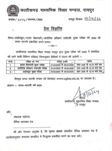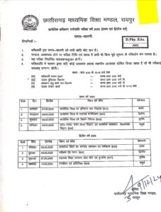 रायपुर: छत्तीसगढ़ माध्यमिक शिक्षा मंडल ने 10वीं और 12वीं के बोर्ड एग्जाम का टाइम टेबल जारी हो गया है । 12वीं बोर्ड की परीक्षा 1 मार्च से शुरू होकर 28 मार्च तक चलेंगी। वहीं 10वीं बोर्ड की परीक्षा 3 से 24 मार्च तक होगी।