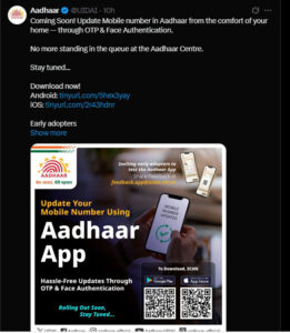 इसके जरिए यूजर्स आधार एप पर OTP वेरिफिकेशन और फेस ऑथेंटिकेशन से अपना मोबाइल नंबर अपडेट कर पाएंगे। इस सर्विस से दूरदराज इलाकों में रहने वाले लोग और सीनियर सिटिजन को आसानी होगी।