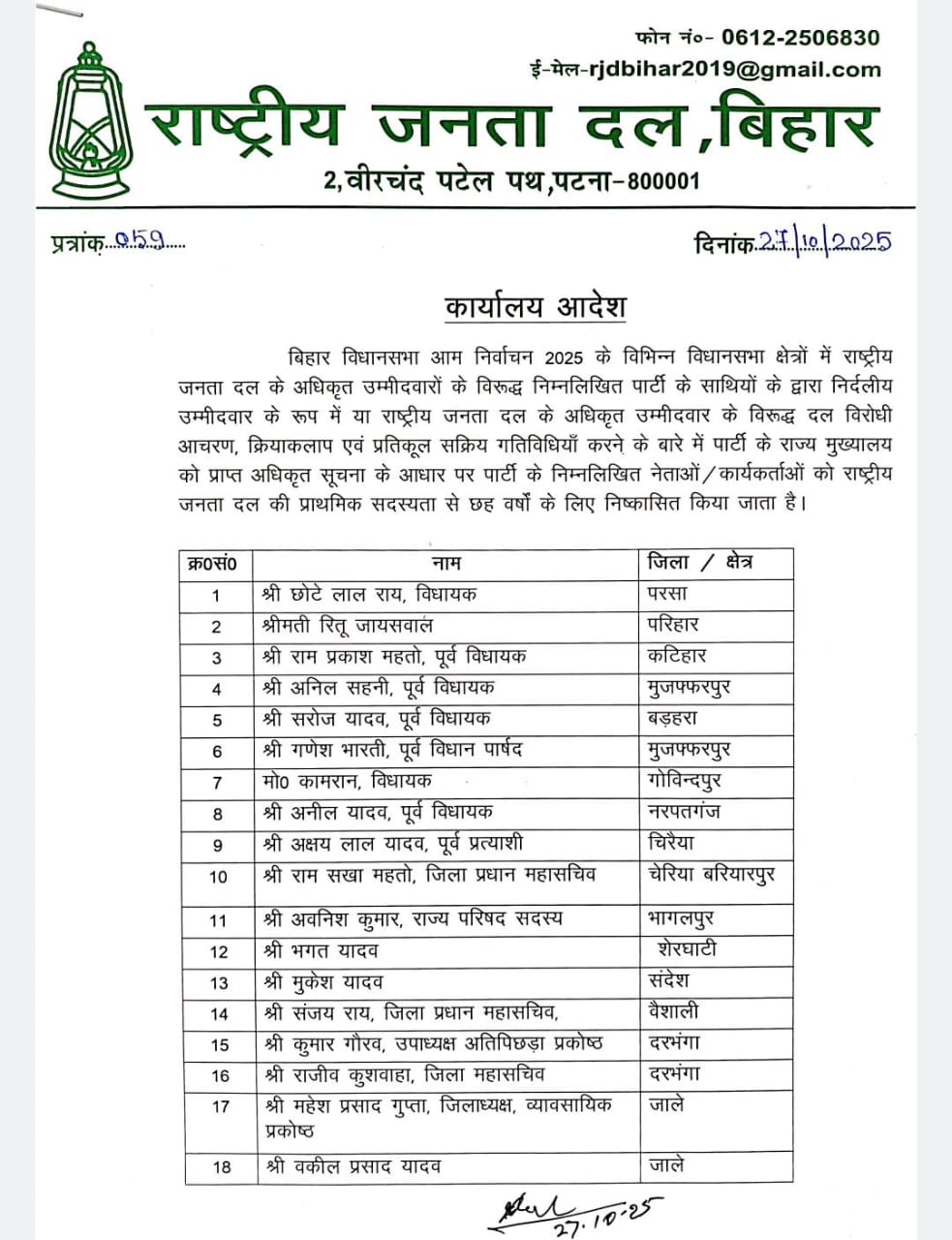 बिहार, पटना: पहले चरण के मतदान से पहले राजद ने 27 नेताओं को पार्टी से निष्कासित कर दिया है। इस लिस्ट में रितु जायसवाल समेत 4 पूर्व विधायक के नाम भी शामिल है। इन नेताओं पर पार्टी विरोधी गतिविधियों में शामिल होने का आरोप लगाया गया है। इन सभी नेताओं को पार्टी की प्राथमिक सदस्यता से 6 वर्षों के लिए निष्कासित कियागया है।