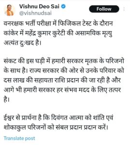 रायपुर। वनरक्षक भर्ती परीक्षा में फिजिकल टेस्ट के दौरान कांकेर में महेंद्र कुमार कुरेटी की असामयिक मृत्यु अत्यंत दुःखद है।