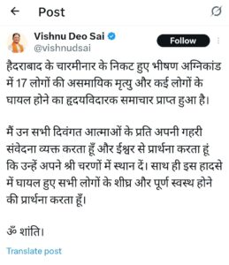 रायपुर: हैदराबाद के चारमीनार के पास भीषण अग्निकांड में 17 लोगों की असमायिक मृत्यु और कई लोगों के घायल हुए।