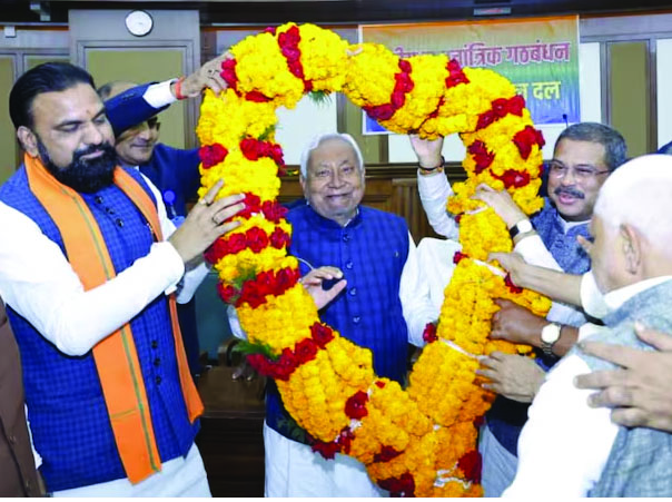 Bihar political news : बिहार चुनाव में एनडीए की प्रचंड जीत के बाद नई सरकार बनाने की कवायद तेज हो गई। सीएम नीतीश कुमार ने राज्यपाल को इस्तीफा सौंप दिया है। और नई सरकार बनाने का दावा पेश किया है। जिसके साथ ही 17वीं बिहार विधानसभा भंग हो गई है। इससे पहले एनडीए की विधायक दल की बैठक में नीतीश कुमार को नेता चुना गया। डिप्टी सीएम सम्राट चौधरी ने उनके नाम का प्रस्ताव रखा। इससे पहले उपमुख्यमंत्री सम्राट चौधरी को भारतीय जनता पार्टी (भाजपा) विधायक दल का नेता तथा विजय कुमार सिन्हा को उपनेता चुन लिया गया है। सम्राट चौधरी को आज आयोजित भाजपा के नवनिर्वाचित विधायकों की बैठक में सर्वसम्मति से विधायक दल का नेता चुना गया। वरिष्ठ भाजपा नेता और उपनुख्यमंत्री विजय सिन्हा सदन में पार्टी के उप नेता होंगे।