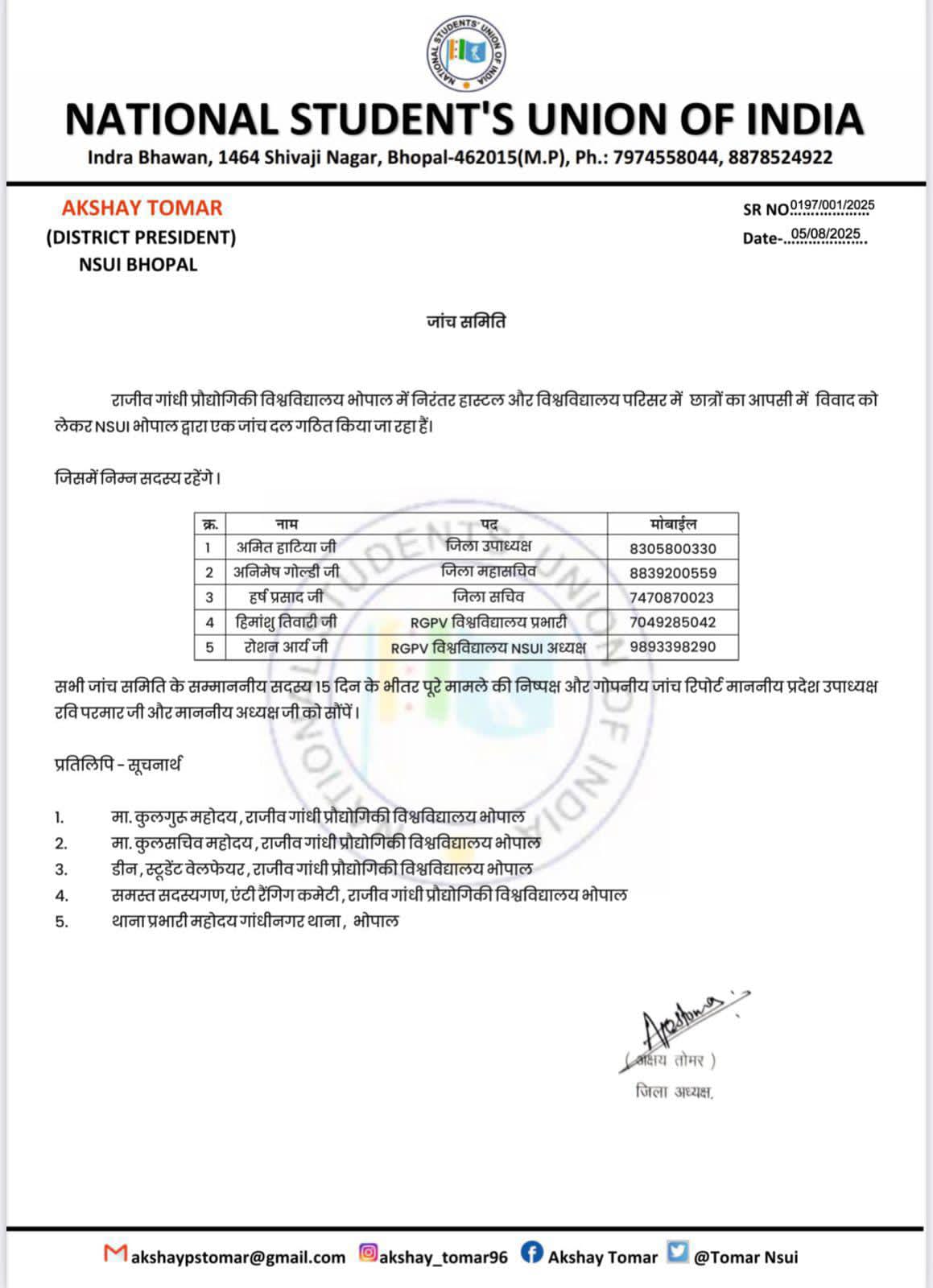 जांच समिति में निम्नलिखित सदस्य शामिल हैं एनएसयूआई जिला उपाध्यक्ष अमित हाटिया जिला महासचिव अनिमेष गोल्डी जिला सचिव हर्ष प्रसाद आरजीपीवी विश्वविद्यालय एनएसयूआई प्रभारी हिमांशु तिवारी एनएसयूआई अध्यक्ष आरजीपीवी विश्वविद्यालय रोशन आर्य हैं ।