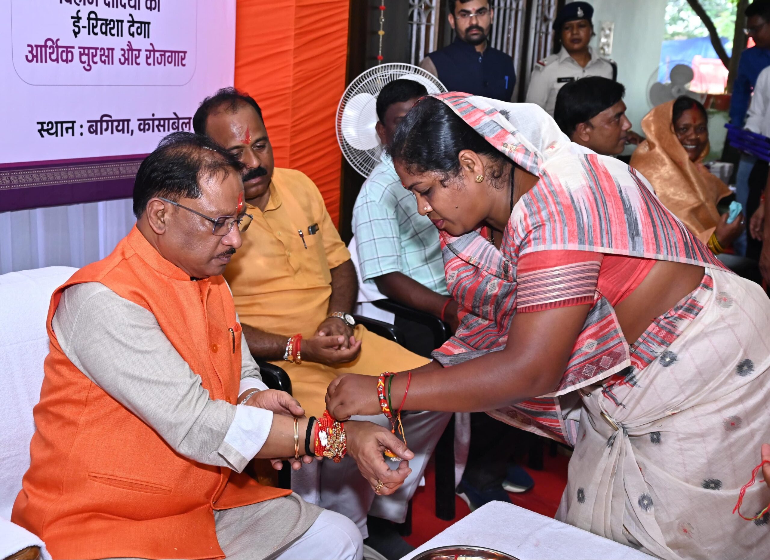छत्तीसगढ़, रायपुर। मुख्यमंत्री विष्णु देव साय के गृह ग्राम बगिया स्थित कैंप कार्यालय में रक्षाबंधन के अवसर पर विभिन्न योजनाओं से लाभान्वित बहनों ने राखी बांधकर आभार व्यक्त किया। प्रधानमंत्री आवास योजना, महतारी वंदन योजना की हितग्राही दीदियों के साथ आंगनबाड़ी कार्यकर्ता-सहायिकाएँ, मितानिन और स्व-सहायता समूह की बहनों ने भी मुख्यमंत्री श्री साय की कलाई पर राखी बांधी और उनके दीर्घायु की कामना की।