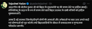 सोशल मीडिया हैंडल X पर तेजस्वी यादव ने लिखा है, “आदरणीय श्री नीतीश कुमार जी को बिहार के मुख्यमंत्री पद की शपथ लेने पर हार्दिक बधाई। मंत्रिपरिषद् के सदस्य के रूप में शपथ लेने वाले बिहार सरकार के सभी मंत्रियों को हार्दिक शुभकामनाएँ। आशा है नई सरकार जिम्मेदारीपूर्ण लोगों की आशाओं और अपेक्षाओं पर खरा उतर अपने वादों एवं घोषणाओं को पूरा करेगी तथा बिहारवासियों के जीवन में सकारात्मक व गुणात्मक परिवर्तन लाएगी।”